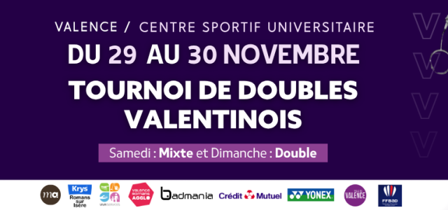 Tournoi de Doubles Valentinois – 29 & 30 novembre 2025 Le Valence Badminton Club vous donne rendez-vous pour son grand Tournoi de Doubles Valentinois, les samedi 29 et dimanche 30 novembre 2025 au Centre Sportif Universitaire de Valence. 🔹 Samedi : Doubles mixtes🔹 Dimanche : Doubles dames et hommes…