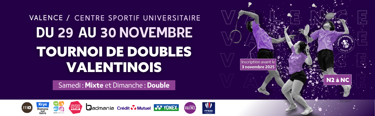 Le Valence Badminton Club vous donne rendez-vous pour son grand Tournoi de Doubles Valentinois, les samedi 29 et dimanche 30 novembre 2025 au Centre Sportif Universitaire de Valence.